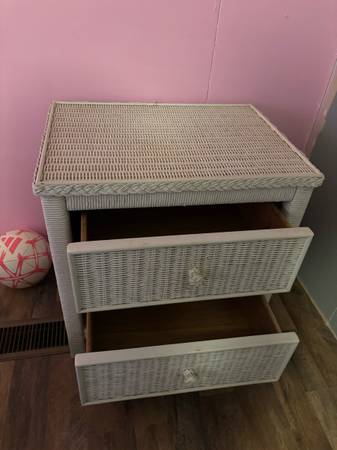 🔥🔥🔥CORRECTION! I have 2 other items all for sale. A long dresser with a mirror and a tall armoire. ALL PIECES FOR ONLY $300 TOGETHER. Please call or text me for more pictures of all the items. 🔥🔥🔥 I have a white wicker nightstand for sale. It’s marked as part of the ‘Henry Link Lexington’ collection. It’s dated back to the 1980’s. My price is $75. I do have other pieces and can do a bundle deal for all of the pieces. I also have a dresser with a mirror and an armoire- all pieces are white wicker - Henry Link Lexington- vintage. All of the pieces have great legs intack also. The drawers are in perfect shape as well. Like new but 40 plus years old.
