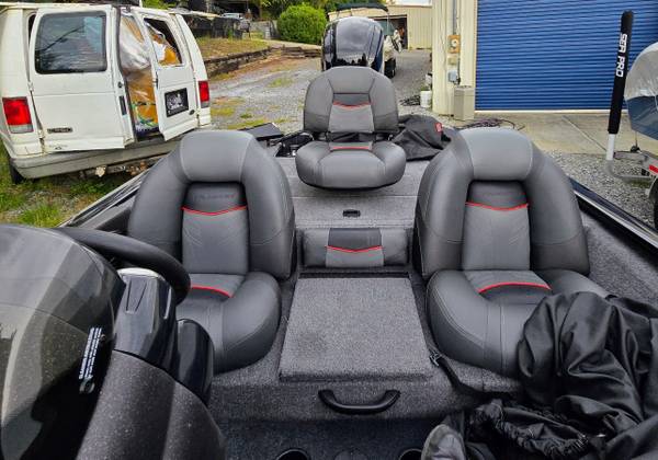 Includes Tracker Single axle Trailer with spare tire and a Garmin Echomap UHD and Lowrance Hook Reveal.