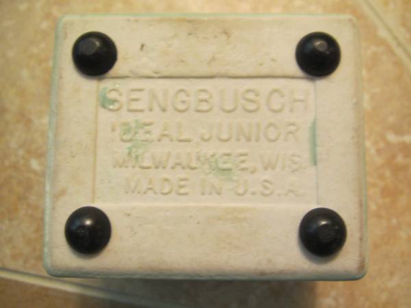 Offered: A Very Old Stamp Moistener . Sengbusch Ideal Junior . Light Green . Ideal Vintage Office Desk Decoration that makes it quick and easy way to moisten fingers, gummed labels, stamps, envelope flaps etc. . Porcelain, Nickel-Plated Brass Bearing that makes it noiseless . Rubber Feet that prevents slipping . chipped corner . Measures about 2 1/8 inch X 2 1/2 inches