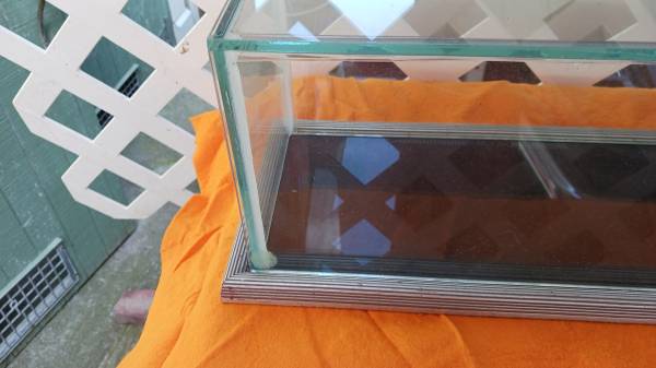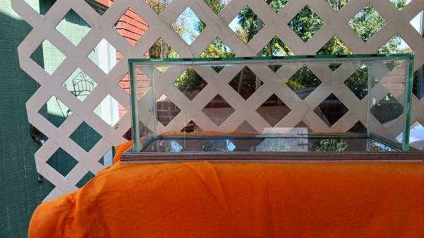 CLEAR GLASS tabletop display case with lift off glass top. This case/display has a mirrored base with wood trim and a lift off solid tempered glass 7"W x 20"L x 7"T, rectangular cover. NO lock. In storage for years and in perfect condition. Outside size is 8 x 22 x 7" Great for displaying cards, baseballs, model ships, anything less than 7" tall.