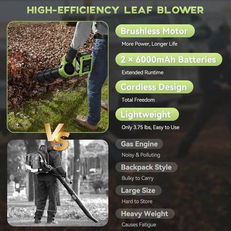 6000mAh Batteries with Fast Charging: This cordless leaf blower comes with two 21V 6000mAh lithium batteries and a fast charger, providing up to 30 minutes of total runtime with both batteries. Each battery fully recharges in just 1.5 hours, and the quick charging feature minimizes downtime—keeping your leaf blower cordless with battery and charger ready whenever you need it