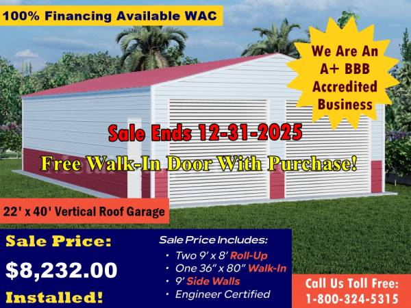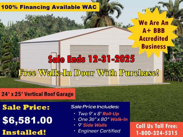Also Available To All Land & Home Owners. Rent-To-Own This Enclosed Metal Garage With No Credit Check, No Proof Of Income, & No Driver's License Required. Early Payoff Is Available & An Upfront Payoff Schedule Can Be Requested. Get Started Online Today At: https://metalcarportdepot.link/RTO-National-Secure-Get-Started