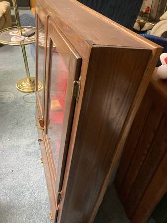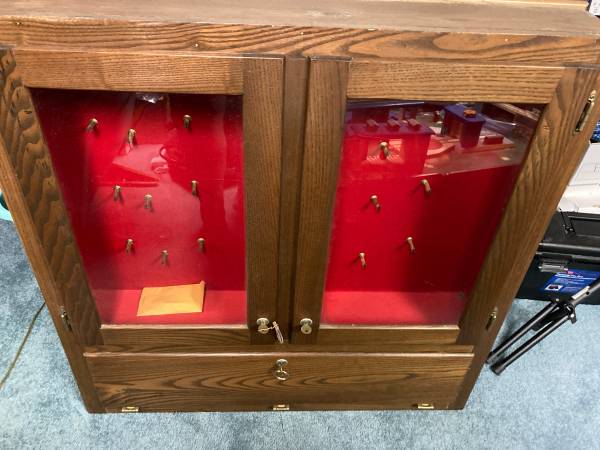 Don Abbott cabinet shop made in 1982 for my dad to his specs out of hand select pecan.top grade hinges and key locks.glass has reflections but no damage! Really nice has not been on wall since 1990!