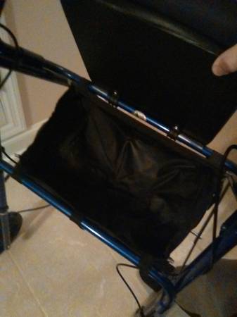Lightly used rolling walker made by Hugo. It has hand-brakes that also lock the wheels when needed, like when bracing to stand or sit. There is a storage area under the seat. It folds for storage or travel.