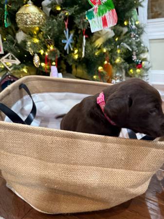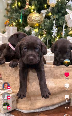 Chocolate lab puppies for sale. Great for hunting and family. Pictures of the Mom and Dad are included here. First round of shots complete. One boycleft. Eight weeks old now. Call .