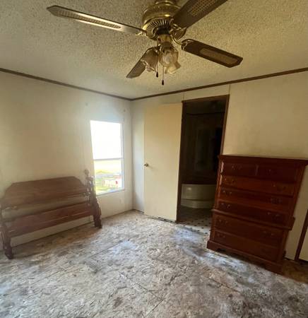 Kitchen opens to living room with 10 ft peaked ceilings. Kitchen comes with appliances. Stove, refrigerator and dishwasher. Laundry room off kitchen. Long hallway to right after entering has two more bedrooms and a shared full bathroom. 3rd bedroom has bay window allowing great natural light in. Front porch is 16 x 20 and comes with the sale. There are ceilings fans in 3 of the rooms including the den. The AC unit is a 2.5 ton capacity blowing super cold air. Heat works perfectly as well. The Axels are in place as well as the hitch. Skirting is in good condition. House was preloved for 20 years.
