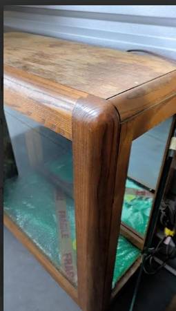 This lighted display case has one glass shelf which is adjustable; access is from either side of the piece. The top looks a mess (it's from the 1980's) and I've simply been using a table runner to cover it. But it should sand/buff out beautifully if you have that DIY gene I lack!