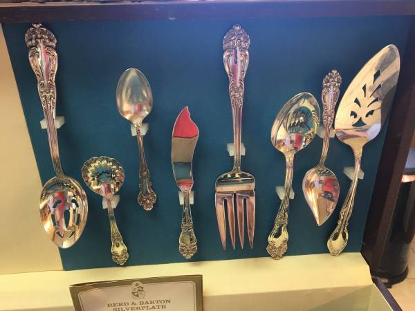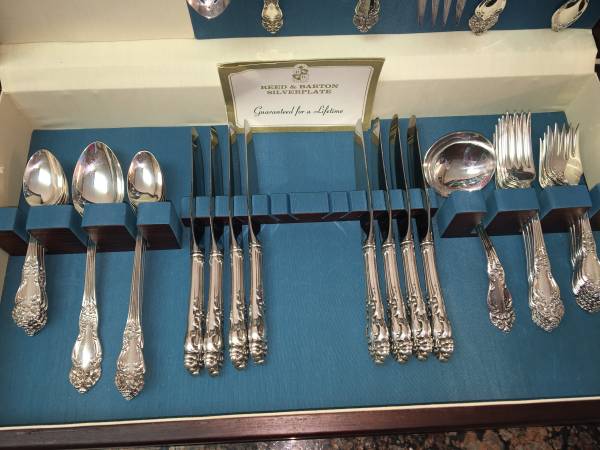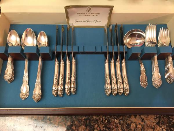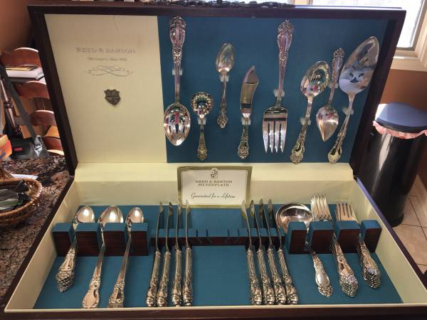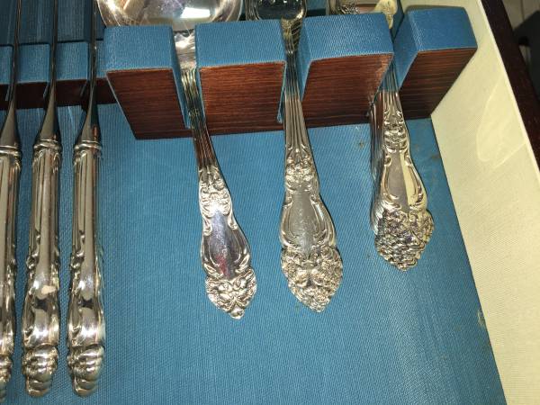 Gorgeous silverplate flatware set. Includes 8 salad forks, 8 dinner forks, 8 spoons, 8 iced tea spoons, 8 knives, 2 serving spoons, meat fork, butter knife, sugar spoon, slotted spoon, soup ladle, and 3 other things that I am not sure what they are. Estimated age is about 90 years old we think. Non-smoking home. Comes with the wood case in picture.