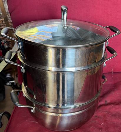 Fruit/vegetable crusher, fruit/vegetable press, very large pressure cooker, heat juicer, strainer. Crusher and press are very heavy so will have to be picked up.