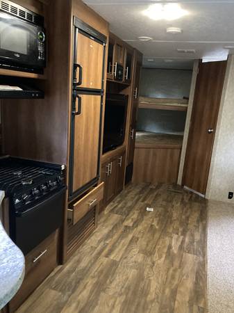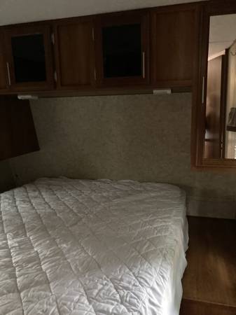 32' tongued trailer, sleeps 8, master bedroom with queen size bed and 1/2 bath, Additional bathroom with stand up shower and sink, kitchen with stove, oven, microwave, refrigerator freezer (runs on electric or propane), outdoor slide out stove and sink and electric refrigerator, NEW 50" TV, 2 electric reclining chairs in slide out living room area, dining area, overhead electric Air Conditioner, built in furnace (runs on electric or gas), thermostat run heater or AC,15 gallon quick heating water heater (runs on electric or propane), electric roll out awning, lots of indoor and outdoor storage space, 2 propane tanks, includes everything you need for set up and immediate use and includes some extra equipment, NEW battery to operate slide out, awning and lights while camping. This camper is in very good to excellent condition. The camper is in storage in Athens Tennessee.