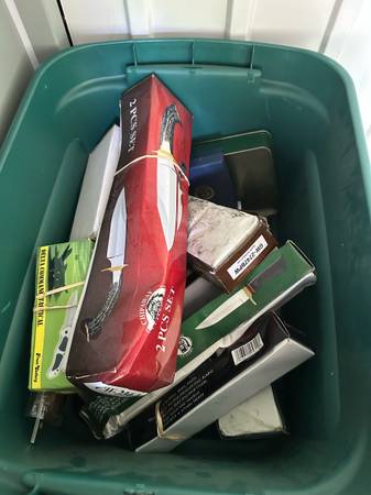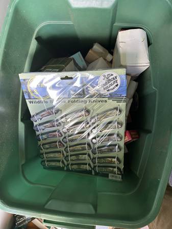 Estimated 500-750 frost cutlery knives new in boxes,totes and bags. Some smith & Wesson, and other brands. Some jack Daniels collectables and army stuff. $1700 buys the whole unit. Great for a reseller/flea market. Will not separate. Have more pictures available upon request.