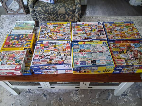 20 1000 piece White mountain puzzles, 11 variety, 2 puzzles missing 1 piece each but they are marked, all edge pieces separated. 1 year of puzzles!