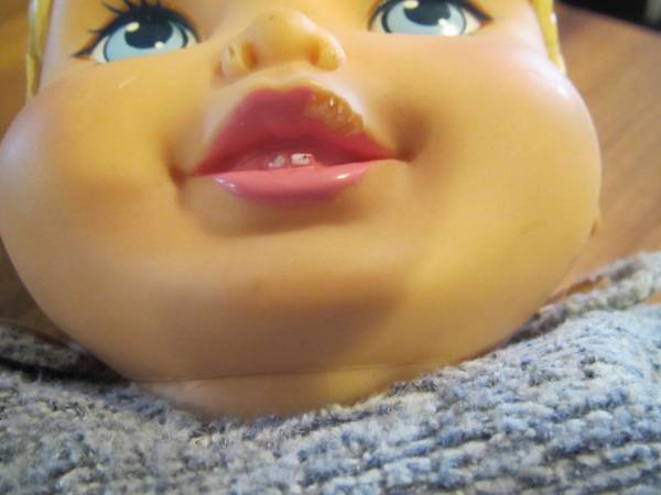 (1.) Lauer Toys Inc 1991 . Original WaterBaby Doll Blonde Hair Blue Eyes . Gotz clothes . About 13 inches Tall X 6.5 inches Wide X 3.5 inches Deep . Molded hair . Rubber . Gotz outfit and shoes pictured come with the doll . Look close at the lip there is some lipstick missing .
