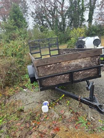 5x10 utility trailer in great shape used very little, tires in good shape and beefed up the gateall lights work and ready to be put to work. Has wooden front and sides to help keep loads secure.